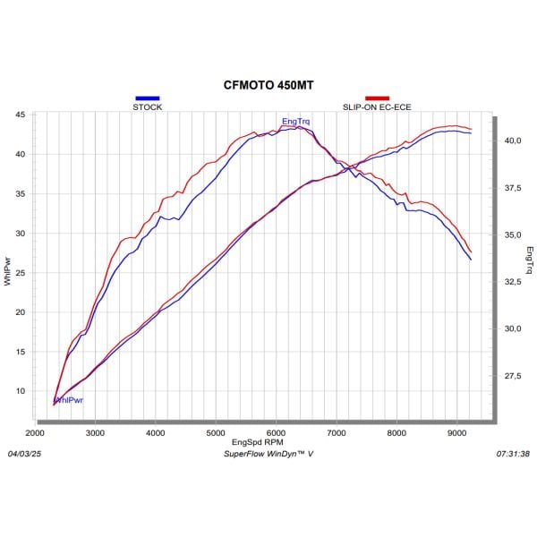 The focus during development was on the aesthetics, sound experience, weight reduction, and achieving the best possible throttle response. It weighs 33.1% (1.2 kg) less than the standard exhaust, and performance gains of 0.7 kW (1.0 hp) at 8,100 rpm and 1.5 Nm at 4,400 rpm in power and torque were recorded during testing on the in-house dyno against a CFMOTO 450MT with a standard stock exhaust.