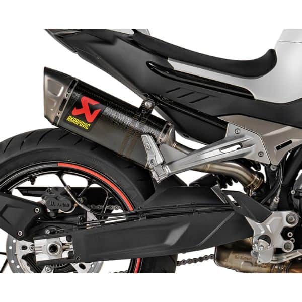 This product has a compact racing-inspired look that seamlessly integrates with the bike’s lines and colour scheme. It is constructed from race-proven materials, including a carbon-fibre muffler outer sleeve and muffler clamp, a titanium end cap, and a stainless-steel link pipe. This creates a weight saving of 30.6% (0.9 kg) compared to the standard stock system and produces a deep sporty tone that highlights the 799 cc twin-cylinder engine.