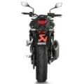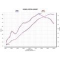 This product is built with a hand-crafted carbon-fibre muffler outer sleeve and a quality stainless-steel inner structure and link pipe, all leading to a high-grade titanium end cap with a new design featuring imprints for a sporty look. Weight is reduced by 45.6% (1.8 kg) in comparison to the standard exhaust. There are power and torque gains, especially in the mid- to high-range revs, with increases of 0.5 kW (0.7 hp) at 5,250 rpm and 0.6 Nm at 5,300 rpm, respectively, when compared to a Honda CB750 Hornet equipped with a standard stock system and tested on the Akrapovič in-house dyno. This is a fully EC/ECE type-approved Euro 5 system, with no remapping needed – just a plug-and-play installation. It serves up a deep, sporty, and vivid Akrapovič sound and is fully compatible with Honda original soft panniers.