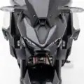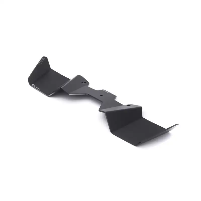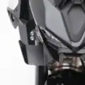 This spoiler is mounted directly under the motorcycle headlight using three screws: one screws into the fork crown, while the other two mount onto the hose brackets located on the lower fork triple clamp.