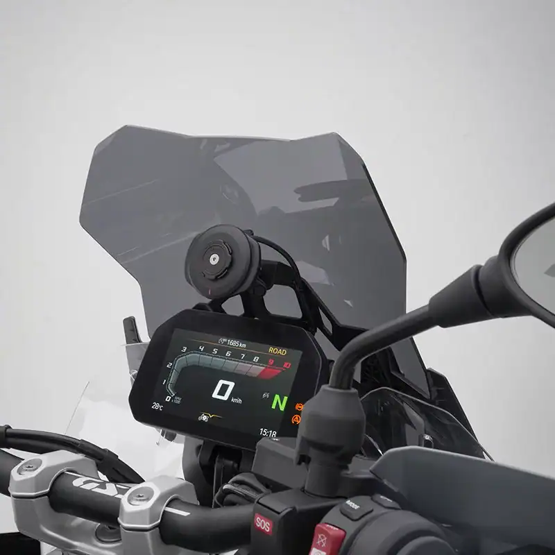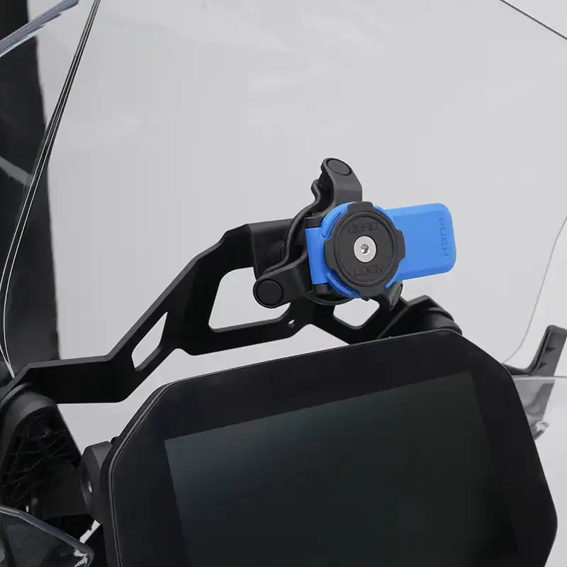 Fitting is simple: the Quad Lock® BCD phone holder for the R 1300 GS attaches to the two mounting holes in the windscreen. Simply apply the included protective foams to protect your fairings. The bracket allows you to keep the original BMW screws on the windscreen of the BMW GS 1300. This mount ensures that your phone holder is securely fixed in the head-up position, without the need to adjust or modify your BMW 1300 GS.